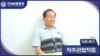 질환명 : 척추관협착증 *치료 : 양방향 내시경 감압 *담당 주치의 : 조보영 원장님 하부 다리가 마비성으로 저려서 집 앞 50~60m 걷는 것이 저승길을 가는 것 같았어요. 집 근처 병원에서 주사를 맞고 신경치료를 해도 돈은 쓰지만 3~4일 좋아질 뿐이었어요. 지인들이 소개 해 주어 연세바른병원 조보영 원장님께 진료를 받았습니다. 조보영 원장님을 딱 봤을 때 마